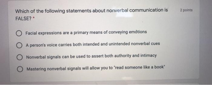 Which of the following statements about nonverbal communication is FALSE. Which of the following statements is FALSE concerning Jimmys research. Facial expressions are a primary means of conveying emotions A persons voice carries both intended and unintended nonverbal cues Nonverbal signals can be used to assert both authority and intimacy Mastering nonverbal signals will allow you to read someone like a book.